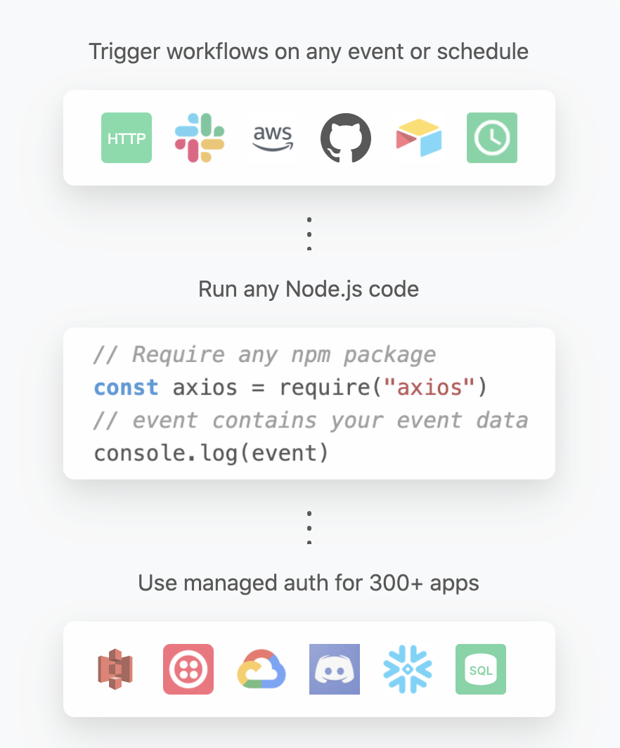 In other tools, you typically have to setup infrastructure to process events — typically you setup an HTTP endpoint, then run a script on a container, or have to manage a serverless function. This takes time to write and maintain.